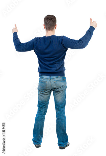 Back view of business man shows thumbs up. Rear view people collection. cheerful office worker shows positive emotions. backside view of person. Isolated over white background. bearded man in