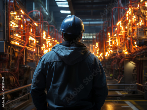 Back view of a engineer or factory worker standing in front of a factory at night.