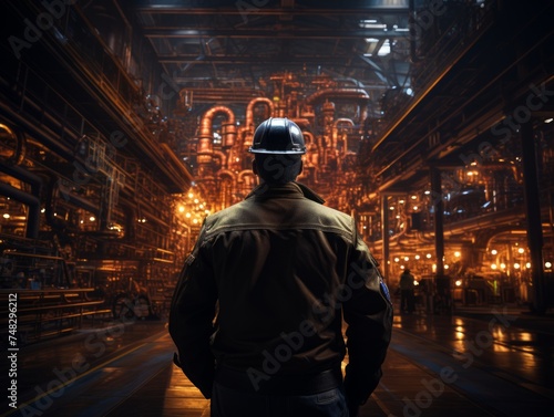 Back view of a engineer or factory worker standing in front of a factory at night.