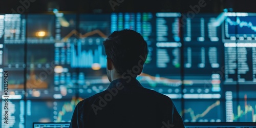 Back view of a man looking at financial graphs on multiple monitors in high-tech office