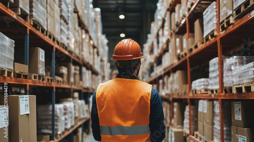 Back view of a worker ensuring all packages are correctly labeled in a warehouse, [employee, inspection, warehouse, back view]