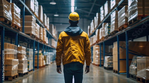 Back view of a worker wearing a yellow hat in a warehouse