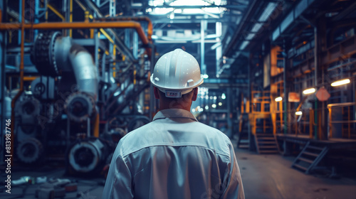 Back view of an engineer in a helmet at an industrial plant with heavy machinery.