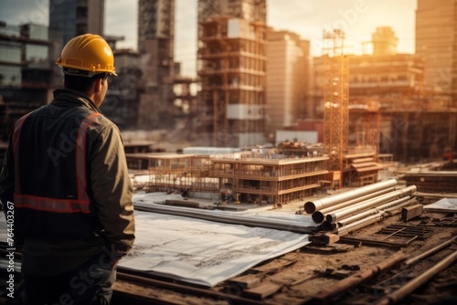 back view of architect engineer or contractor at construction site supervising building