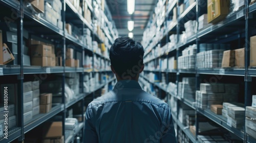 Back view of diligent worker scanning shelves in a storage facility