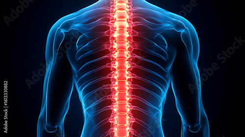 Back view of human anatomy illustration with glowing spine. Depicts bone structure and muscular representation. Back pain, posture, anatomical study.