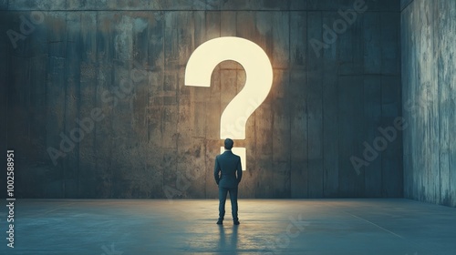 Back view of tiny businessman in concrete room interior with huge bright question mark opening. Doubt and choice concept