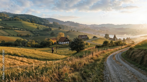 Back view of unrecognizable man on a bicycle on rural road at sunrise. Generative AI image