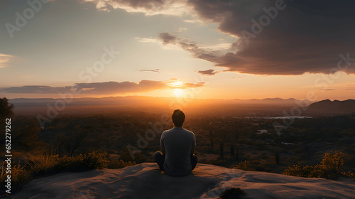 Back view of young man hiker on rock sitting on the mountain peak and beautiful mountains in fog at sunset in summer, man sit alone relaxing in nature during sunset