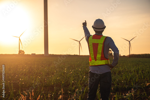 Back view wind turbine engineer man pointing at windmill in wind farm on sunset
