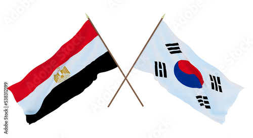 Background, 3D render for designers, illustrators. National Independence Day. Flags Egypt and South Korea