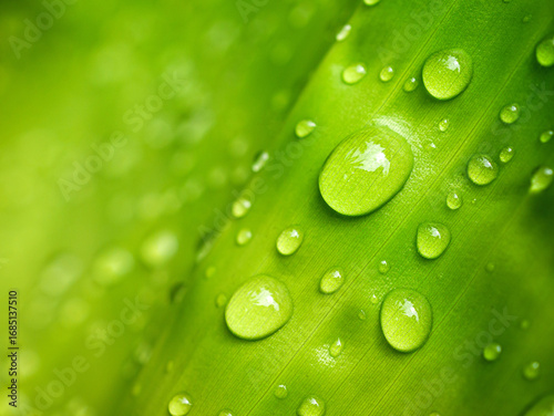 Background and Texture Water drops on banana leaves, macro of backdrop nature
