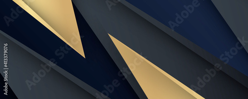 Background, black and gold halftone shine dots on geometric triangle pattern, vector. Golden confetti glitter on black gradient background, glittery polygon or 3d abstract card layout