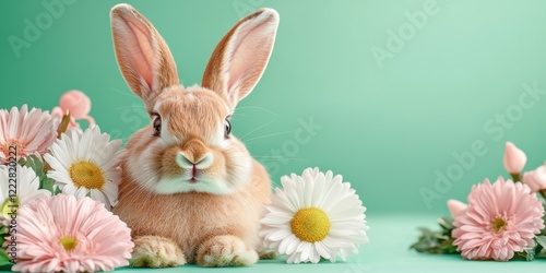 Background composition of Easter Day frame with egg concept. Cute rabbit surrounded by pink flowers on a soft green background