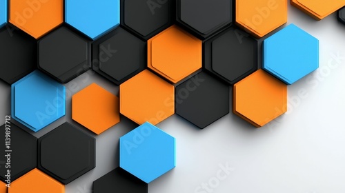 background concept. Colorful hexagonal patterns in black, blue, and orange on a light background.