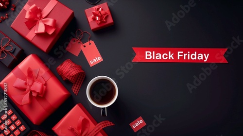 Background for a banner for Black Friday sales. Red gift boxes, calculator and cup of coffee on a black background, top view. Conceptual banner design template for special offer, sale. 3d rendering.