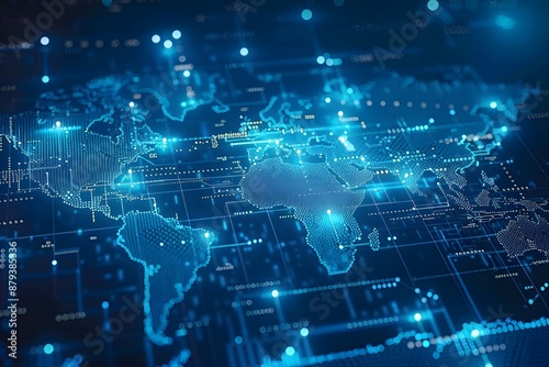 Background image with world map graphically drawn in blue, digital technology image glowing with digital light