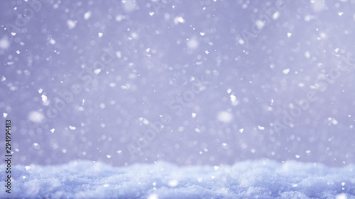 Background of a snowy landscape against a blurred fond. Fresh snow texture in blue tone. Copy space for text.