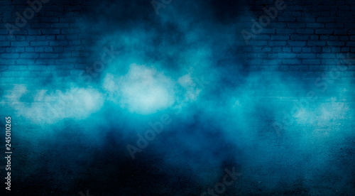 Background of empty dark room with brick walls, illuminated by neon blue lights with laser beams, smoke