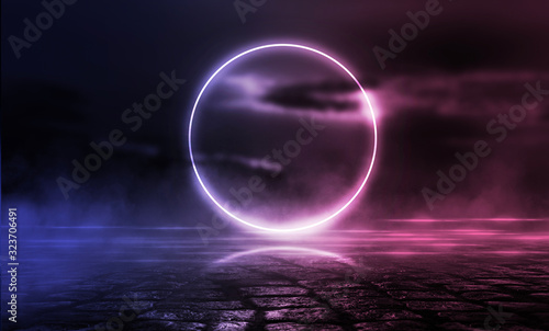 Background of empty stage show. Neon blue and purple light and laser show. Laser futuristic shapes on a dark background. Abstract dark background with neon glow