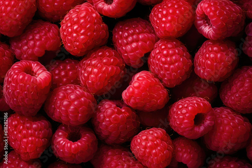 Background of fresh sweet red raspberries arranged together. Concept of healthy diet. Generative AI