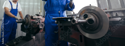 Background of mechanic worker or metalworker using metal lathe machine operate polishing car disc brake at auto repair garage. Maintenance automotive and inspecting vehicle part concept