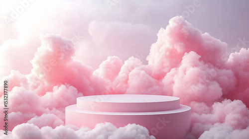Background podium pink 3d product sky platform display cloud pastel scene render stand. Pink podium stage minimal abstract background beauty dreamy space studio pedestal smoke showcase geometric white