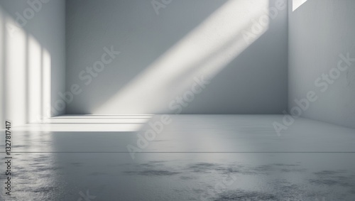 Background shadow with white light on the floor, backdrop overlay mockup of summer sunlight in a room with a cement wall and floor. Abstract blur mockup effect with a grey minimal platform for prod...