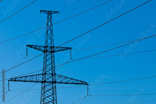 Background, view or scene of steel tower of electric main or electricity transmission line with the wires silhouette on background of clear blue sky