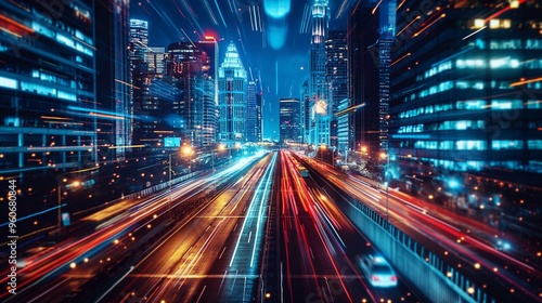 background with A nighttime view of a futuristic city with glowing skyscrapers and moving traffic