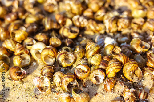 Background with dead snail shells on the sandy seashore, riverbank in summer sunny day. View from above. Many different seashells flatly. Selective focus. Summer theme. Atlantic Sea inhabitants.