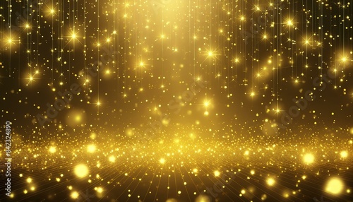 Background with falling golden glitter particles. Golden confetti falling with magic light. Beautiful light background