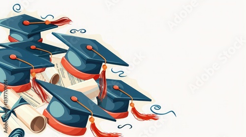 Background with Graduation caps and diplomas on a white background with copy space, symbolizing celebration, achievement and a bright future. Ideal for academic themes.