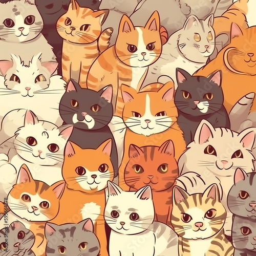 Background with many cute different cats in cartoon style, nice children wallpaper, baby products packaging design, ai generative