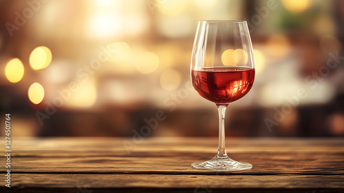 Background with wine glass, wooden table on an extremely blurred backdrop, creating an elegant and sophisticated ambiance. Perfect for display or editing as a dining background. A glass of red or whit