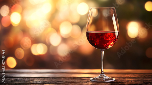Background with wine glass, wooden table on an extremely blurred backdrop, creating an elegant and sophisticated ambiance. Perfect for display or editing as a dining background. A glass of red or whit