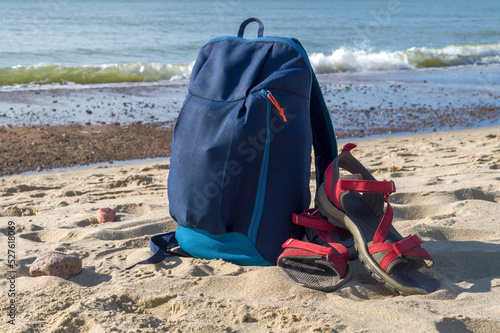 Backpack and sandals against the backdrop of nature. Walking along the seashore.