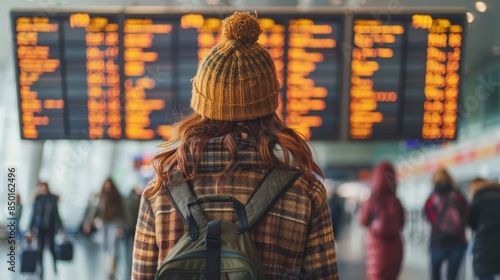 Backview of Woman Checking Flight Information Board and Travel Time at International Airport