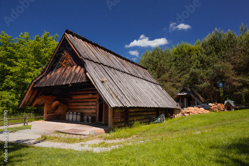 Bacówka w Czorsztynie i okolice. Góralska chata otoczona zielenią.