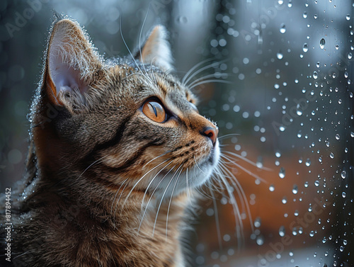 Bad weather, dog and cat looking sadly outside through a rainy window pane