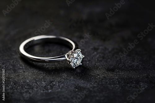 Bague de fiançailles en or blanc avec diamant solitaire, bijou élégant en gros plan sur fond texturé sombre avec espace négatif copyspace