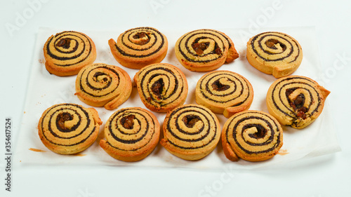 Baked cookies with raisins and poppy seeds isolated on white background.