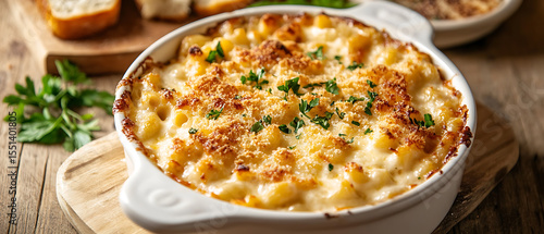 Baked Macaroni and Cheese with Crispy Topping in a Ceramic Dish