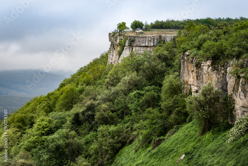 BAKHCHISARAI, RUSSIA - 7 MAY, 2019: The rock above the mountain valley with a car on top in the fog on the background of a stormy sky near the town of Bakhchisarai in the Crimean Mountains