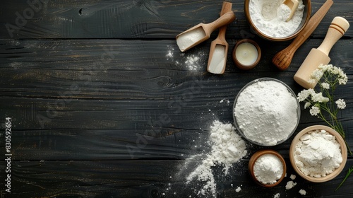 Baking powder and products arranged in a flat lay on a dark wooden surface Room for text