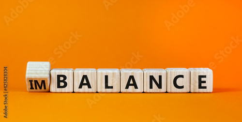 Balance or imbalance symbol. Turned cubes and changed the word imbalance to balance. Beautiful orange background, copy space. Business, balance or imbalance concept.