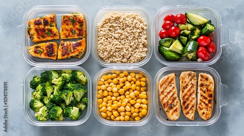 Balanced meal prep containers filled with grilled chicken, broccoli, chickpeas, cucumbers, tomatoes, and grains, ideal for healthy eating.