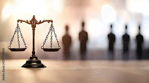 balanced scale symbolizes justice and fairness, with blurred figures in background representing society