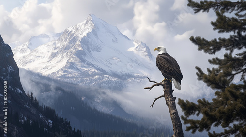 Bald Eagle on Snowy Mountain. A majestic bald eagle perched on a tree branch with a snow-covered mountain in the background.