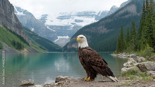 Bald eagle standing on rocky shore of mountain lake with pine forest and snowy peaks in peaceful landscape